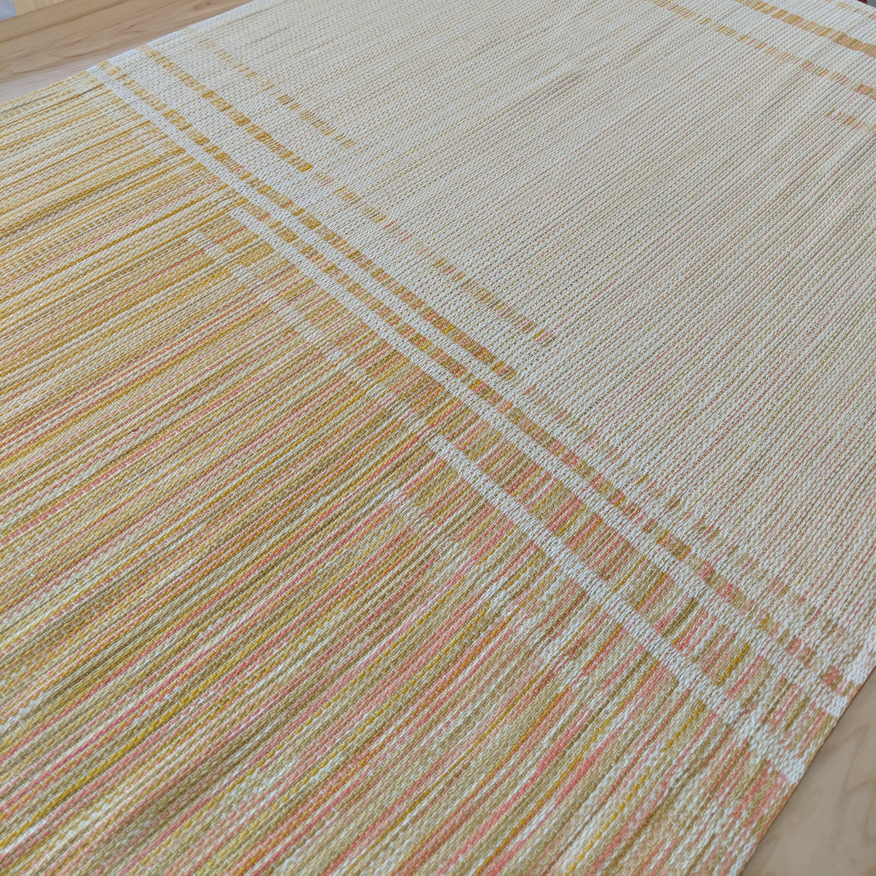 Designed for continuity of use over the changing phases of life with little ones, Analemma starts as a long wrap that can be converted into a skirt and ring sling (the ring sling itself can be further converted into a skirt when the babywearing years are done.) If you look closely, you can see that along the rails are tiny woven in markers as reference points for future skirt panels – this is because the seemingly random placement of lines in the weave will all emerge from the bottom hem of the skirt in the textile’s final form.